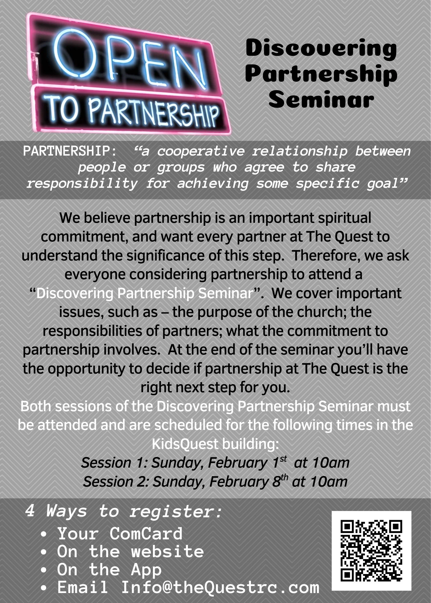 Register below if you would like to attend the Discovering Partnership Seminar. The two sessions will be held on Sunday mornings at 10am on February 1st & February 8th. Join us to learn more about the mission and vision of The Quest Church. At the conclusion you can decide if partnership is the next right step for you to take!