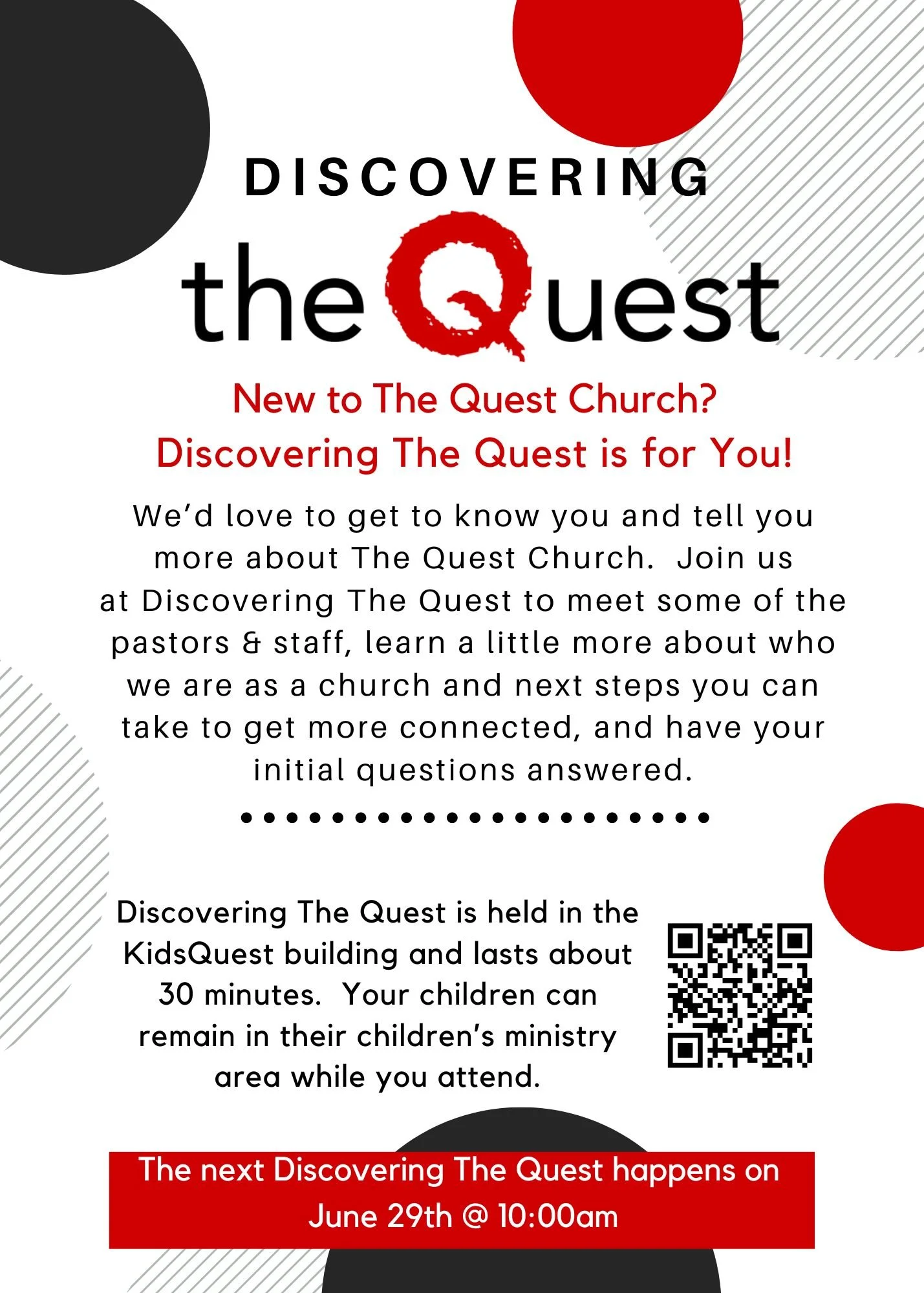 Welcome to the Quest! Whether you’ve come once or several times, we would love to get to know you at Discovering The Quest. Register below, and we look forward to meeting you!